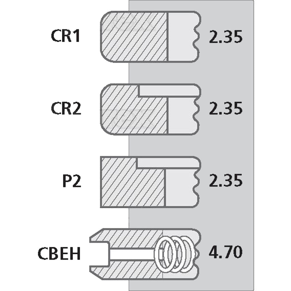 For Diesel Tractors with non-Turbo engines Top Ring: CR1 - Chrome Plated Barrel Faced (3.00mm) 2nd Ring: CR2 - Chrome Plated Barrel Faced Internally Stepped Top (2.38mm) 3rd Ring: P2 - Parallel Faced Internally Stepped Top (2.38mm) 4th Ring: CBEH - Chrome Plated Bevelled Edge with Helical Coil Spring (4.76mm)Reference Numbers: