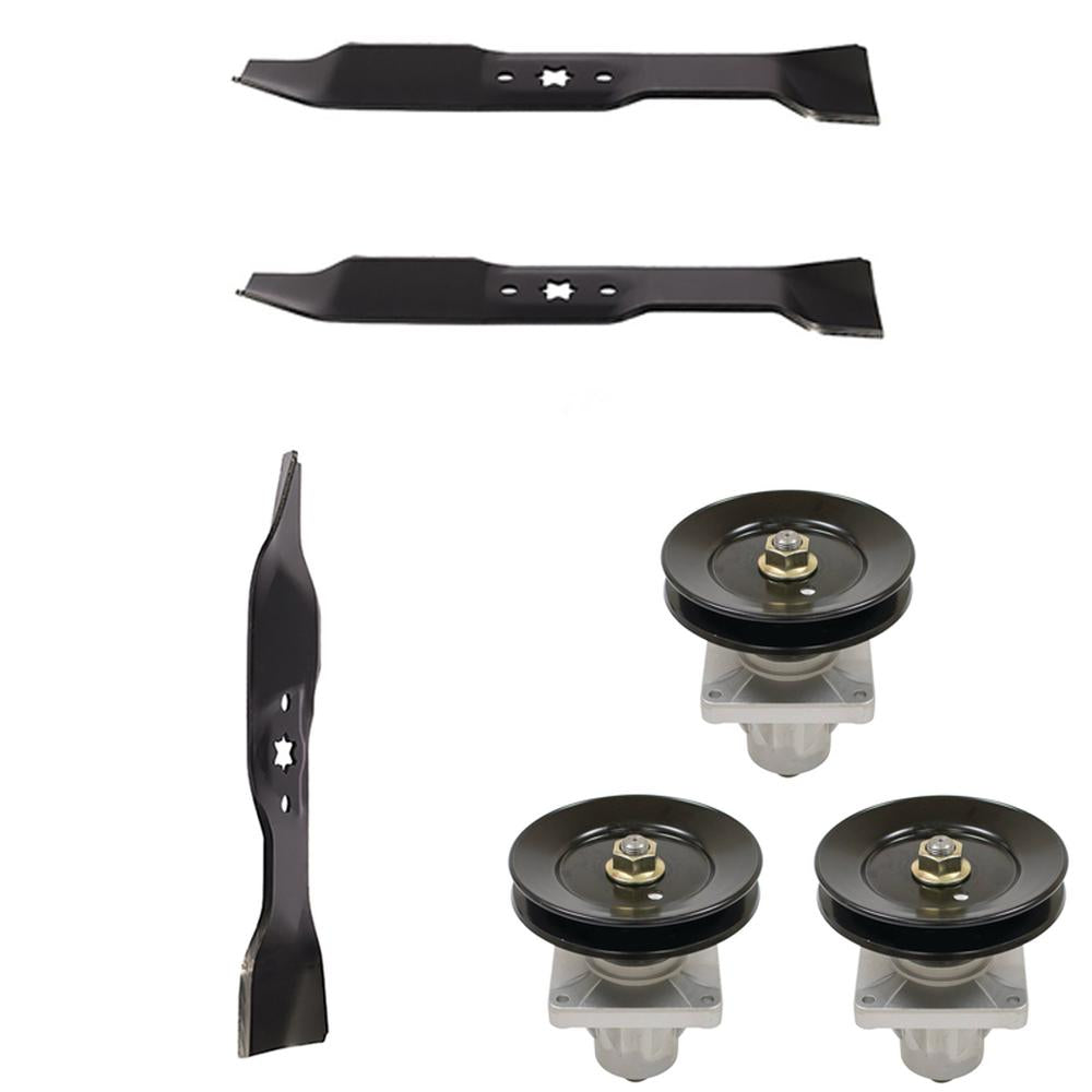 Kit Contains: (3) Spindle Assemblies Height: 6-3/4" Pulley OD: 5-5/8" Includes nut, spacer, grease zerk and pulley, 6 pt. star design, No threads in housing, use self-tapping screws Replaces Part Number(s): 618-0660, 618-0660A, 618-0660B, 918-0625B, 918-0660, 918-0660A, 918-0660B, 618-04137, 618-0625A, 618-0625B, 918-04137 (1) Mulching Mower Blade Length: 15" Width: 2-1/2" Thickness: 0.149" Center Hole: 6 Point Star Replaces Part Number(s): 742-04124, 742-0645, 759-04106, 942-04124, 942-0645, 742-0612, 742-0612A, 942-0612, 942-0612A, 942-612 (2) Mulching Mower Blade Length: 16-1/4" Width: 2-1/2" Center Hole: 6 Point Star Thickness: .150" Replaces Part Number(s): 742-04125, 942-04125, 742-4125, 172-7926, 177-2144, 742-0611, 742-0611A, 742-0644, 742-611, 942-0611, 942-0611A, 942-0644Reference Numbers: