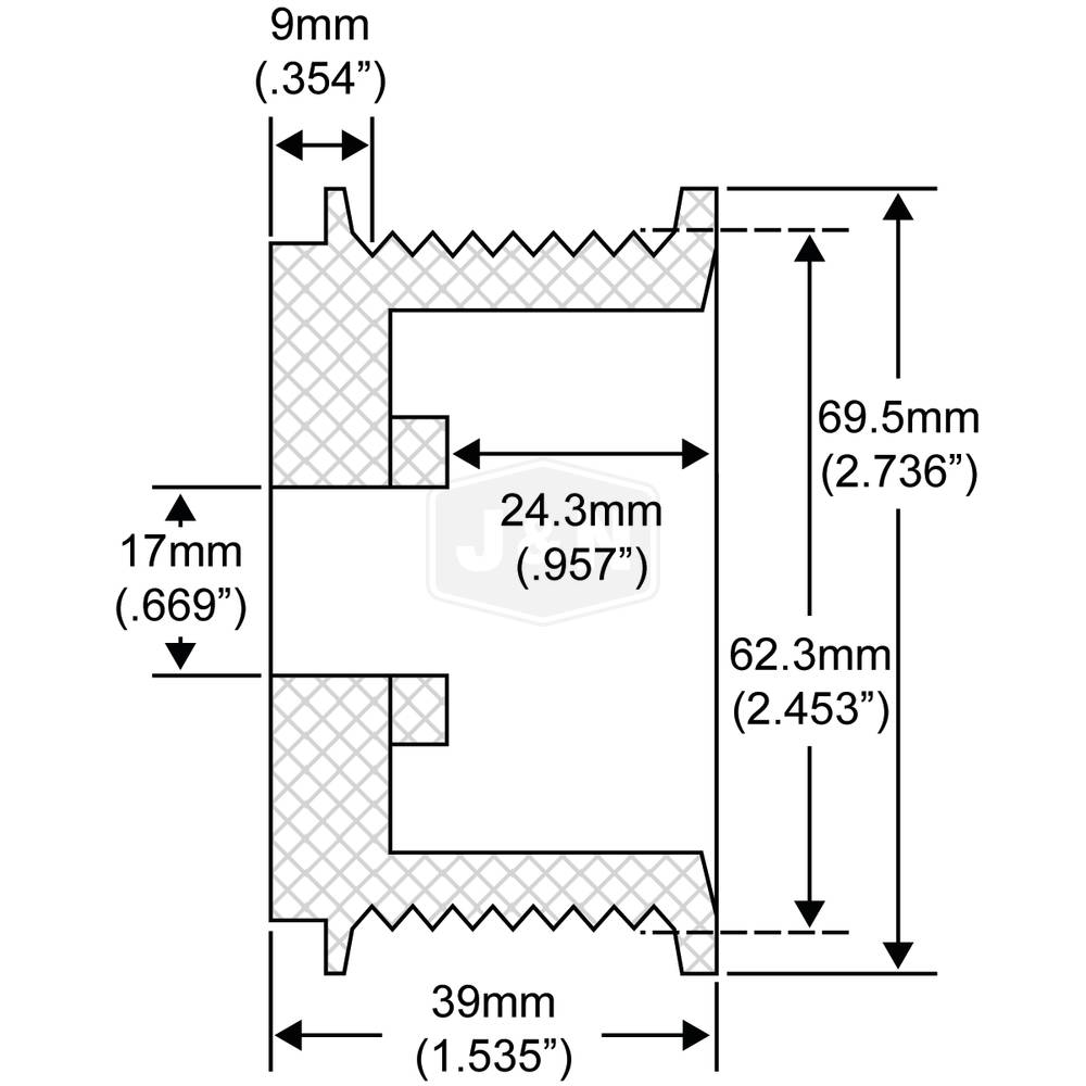 -GROOVE OD: 2.453", GROOVE OD: 62.300mm, GROOVE TYPE: Serpentine, ID: 0.669", ID: 17 mm, NUMBER OF GROOVES: 8, NUT RECESS: 1.209", NUT RECESS: 30.700mm, OD: 2.736", OD: 69.500 mm, PULLEY TYPE: Solid, THICKNESS: 39 mm