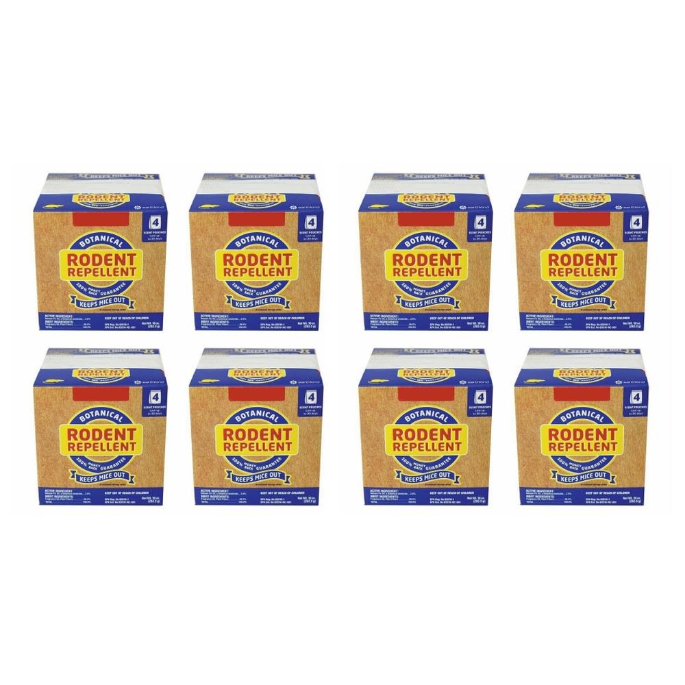 Includes 8 Boxes (contains 4 pouches in each Box) All Natural, No Poisons Child, Pet, and Livestock Safe Federal EPA Certified in all 50 States EPA Registration No. 82016-1 Made in USA since 1995 A natural & effective rodent repellent. NATURAL: Made from natural, sustainable ingredients & produced by American farmers. Each pleasantly scented 2.5 oz pouch is individually wrapped to stay fresh until you need it. EFFECTIVE: Simple place Fresh Cab pouches as directed in areas you want to protect from rodents and forget about it. Lab tests prove the active botanical ingredient of balsam fir oil repels mice for up to 90 days.Reference Numbers:
