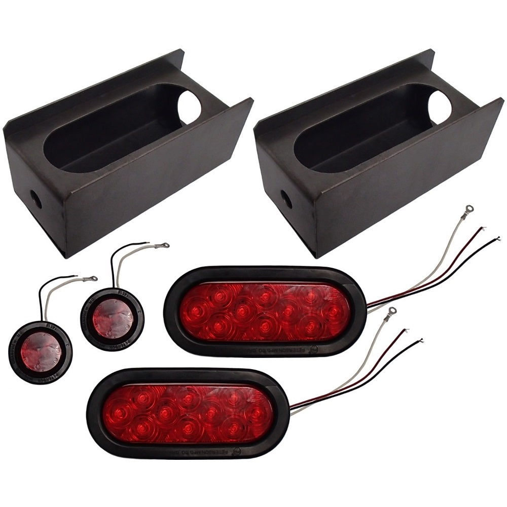 Kit Contains: (2) Oval Tail Light Guard Steel Box These are sold as a pair. Weld-on Type Heavy Duty Steel Box with Oval Opening for Tail Light. Box Length: 8.75" Box Width: 4" Box Height: 3.75" Light Hole Length: 6.75" Light Hole Width: 2.50" Fits Standard Sealed 6.50" Oval Tail Lights and 2" Side Clearance Lights. Tail Light Guard Box for Trailers, Utility Trucks, etc. Replaces Part Number(s): H2T, H2T-BOX (2) 6" Red Oval Light w/ Wiring Harness 12V, Comes with Light, Wire Harness Adaptor, & Rubber Grommet UB LIGHTS Info: 10 Diodes Oval LED Stop/Turn/Tail Red Lamp with Pigtails / Wiring and Open Back Grommet Lamp Dimensions: 6-1/2" L x 2-1/4" W x 1-1/8" H Mounting Clearance: 1-7/8" Depth 12V Application LED Sealed Road Lamps feature Polycarbonate Body and Lens. Lamps are hermetically Sealed to keep out Road Contaminants and Moisture. The Solid State Circuit Boards are Epoxy-Coated to Resist Condensation and Shock to Diodes. LED Lamps feature Long Life, Low Amp Draw and are Resistant to Vibration. All Lamps are Compliant to FMV55108 DOT Standards & MOT CMV55108 Safety Standards and are coded accordingly. Lamps feature Conventional 3-pronged Pigtails for Easy Change-Overs from Incandescent Lamps. Replaces Part Number(s): 019-03-381, 01903381, 1-019-03-381, 101903381, 820KR-10, 820KR10, 019-03-305, 01903305, 1-019-03-305, 101903305 (2) 2" Red Round Light w/ Wiring Harness UB LIGHTS Info: 10 Diodes 2" Sealed Round LED Clearance Marker Red Lamp with Pigtails / Wiring and Open Back Grommet Lamp Dimensions: 2" Diameter x 3/4" H 12V Application Replaces Part Number(s): V198KRReference Numbers: