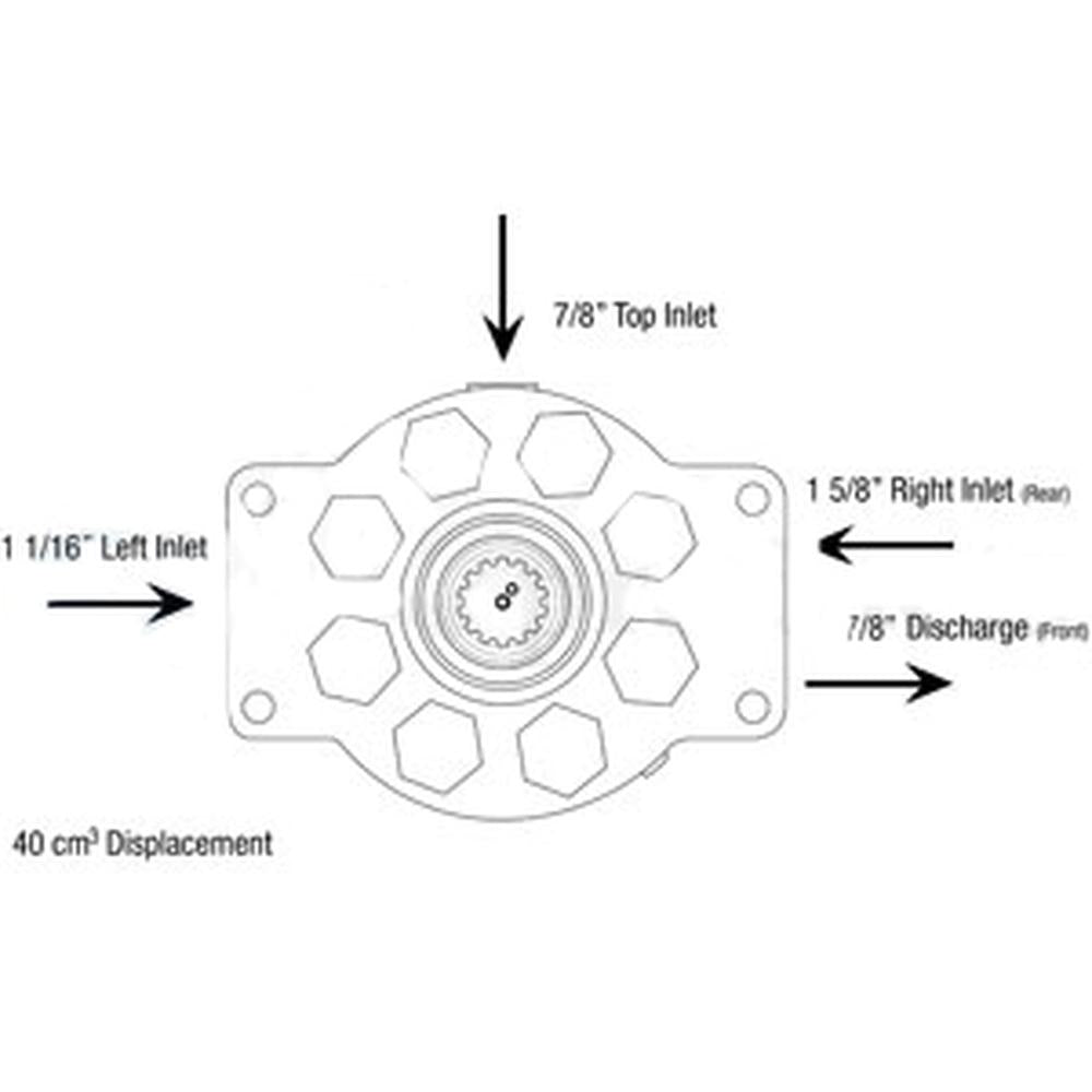 Tech Info: PLEASE SEE SPEC PICTURE TO CONFIRM INLET/OUTLET SIZES AND LOCATIONS40 CC PUMPThe 3 month manufacturer’s warranty on this pump requires the following steps be taken prior to installation of the pump:Flushing the hydraulic system: When hydraulic pumps fail, they often release metal shavings into the hydraulic system. It is necessary to drain your hydraulic fluid, completely flush your system, clean your sump screen, and install a new hydraulic filter and new hydraulic fluid prior to installing the new pump.Checking the transmission pump: Your transmission pump feeds hydraulic fluid to your hydraulic pump. A faulty transmission pump will cause a hydraulic pump to fail. You must confirm your transmission pump is working correctly prior to installing the new pump.All of our pumps are 100% new parts and bench tested for pressure and functionality. Following the above is necessary to give you the best long term performance.