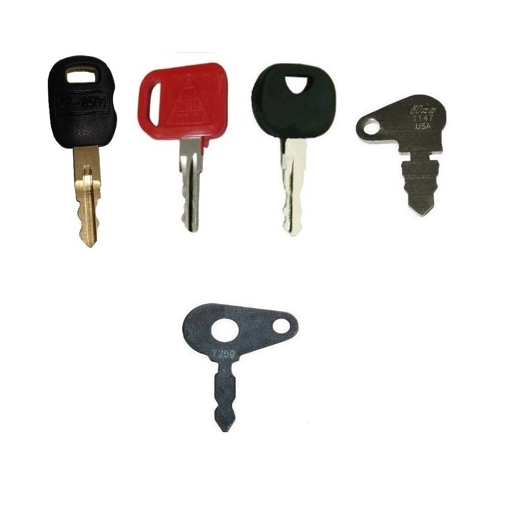 Set Includes: Seventeen (17) Heavy Equipment Keys (1) Key: For Backhoe Loaders, Combines, Compact Tractors, Cotton Pickers, Cotton Strippers, Excavators, Feller Bunchers, Forage Harvesters, Front Mount Mowers, Greens Mowers, Lawn Mowers, Lawn/Garden Tractors, Loaders, Motor Graders, Sugar Cane Harvesters, Tractors, Windrowers For Ignitions, Some Fuel Caps, Cab Doors, Access Panels, Hoods, Engine Side Shields, etc. Replaces Part Numbers: AT145929, AR51481, AT195302, DAR51481, DAT145929, DAT195302, R45361 (1) Key: For Loaders, Skidders, Off Highway Trucks, Dump Trucks, Telehandlers, Excavators, Graders, Scrapers, Dozers, Pavers, Tractors, Dump Trucks Old Style Key - Marked 5P-8500 For Ignition Switch Part Numbers: 1107887, 1428858, 1632659, 3E0156, 7Y3918, 9G7641 For Padlock Part Numbers: 2462641 For Fuel Cap Part Numbers: 086-1781, 099-8548, 096-3100, 0861781, 0998548, 0963100 Also for Cab Doors & Side Panels Replaces Part Numbers: 5P-8500, 5P8500, 2045-432, 0310-072 (1) Key: For Compactors, Tractors, Backhoe Loaders, Mini Excavators, Excavators Marked 14607 For Doors & Ignitions Replaces Part Numbers: 14607, 701/45501, 701/14657 (1) Key: For Forklifts, Skid Movers, Skid Steer Loaders Common Key - Marked 166 Replaces Part Numbers: 166, 51335040, A214062, 7738-4578, 090-32025, 090-32026, 1430, 186304, KM31166P, 91033317 (2) Key: For Mini Excavators, Excavators Marked HD62 Replaces Part Numbers: HD62 (1) Key: For Excavators, Dozers, Loaders, Forklifts Marked 787 Replaces Part Numbers: 787, TR261434, TR261434-001 (1) Key: For Dozers, Industrial Tractors, Lawn Tractors, Backhoes Snoopy Key - Marked 1147 Replaces Part Numbers: 1147, 83353, 192922V1, 192922M1, 194745M91, 194747M91, 504808M91, 192922M91, 180923M91, 1031664M1, 180923M1, 192293M1, 192923M1, 20A192, PBA3636L, PBA2233, PBA3636R, 31-2747317, 8335, 83357, R30074, B17575, 70306 (1) Key: Bare Metal - For Master Disconnect Replaces Part Numbers: 8398-KEY, 8H-5306, 8H5306 (2) Key: For Skid Steer Loaders, Scissor Lifts Common Key - Marked D250 Replaces Part Numbers: D250, 6693241, 6709527, A77313, 58917261 (1) Key: For Excavators, Dozers, UTVs, Wheeled Excavators, Forestry Excavators, Compact Excavators, Dump Trucks, Bulldozers, Tractors (1) Key: Plain Metal - #22 Replaces Part Numbers: H800, AT194969, AT147803, 4286465 (2) Key: For Mini Excavators, Track Loaders Marked H806 Replaces Part Numbers: H806, 17001-00019, 180845 (1) Key: For Excavators, Mini Excavators, Tractors, Wheeled Loaders Marked K250 Replaces Part Numbers: K250, 2420Z1030D2, YN50501010P1, 3211070170 (1) Key: For Excavators Marked S450 Replaces Part Numbers: S450, KHR20070, KHR-0369, 150979A1 (1) Key: For Backhoe Loaders, Chippers, Combines, Compact Tractors, Crawlers, Engines, Excavators, Forage Harvesters, Forklifts, Generators, Industrial Tractors, Skid Steer Loaders, Telehandlers, Tractors, Wheel Loaders Marked T250 Replaces Part Numbers: T250, 8223438Reference Numbers: